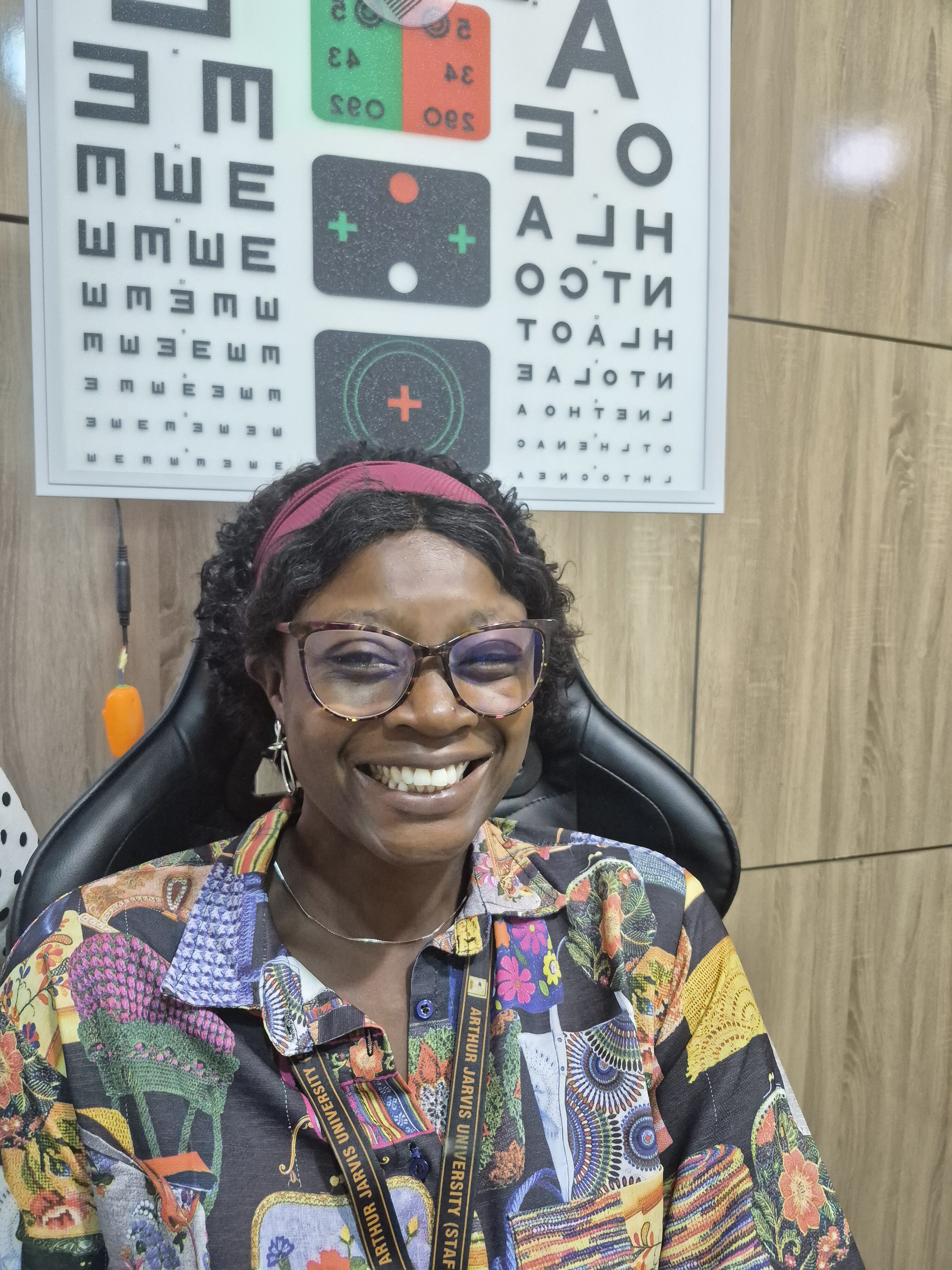 An OGS-funded Optometry Education Project changed that. The initiative, based at Arthur Jarvis University, works to strengthen local optometry capacity by equipping clinics with modern diagnostic equipment, bringing quality eye care directly to communities that previously had none. Eunice visited one of the supported clinics, received a comprehensive eye examination at no cost, and was fitted with corrective glasses at a price she could manage.